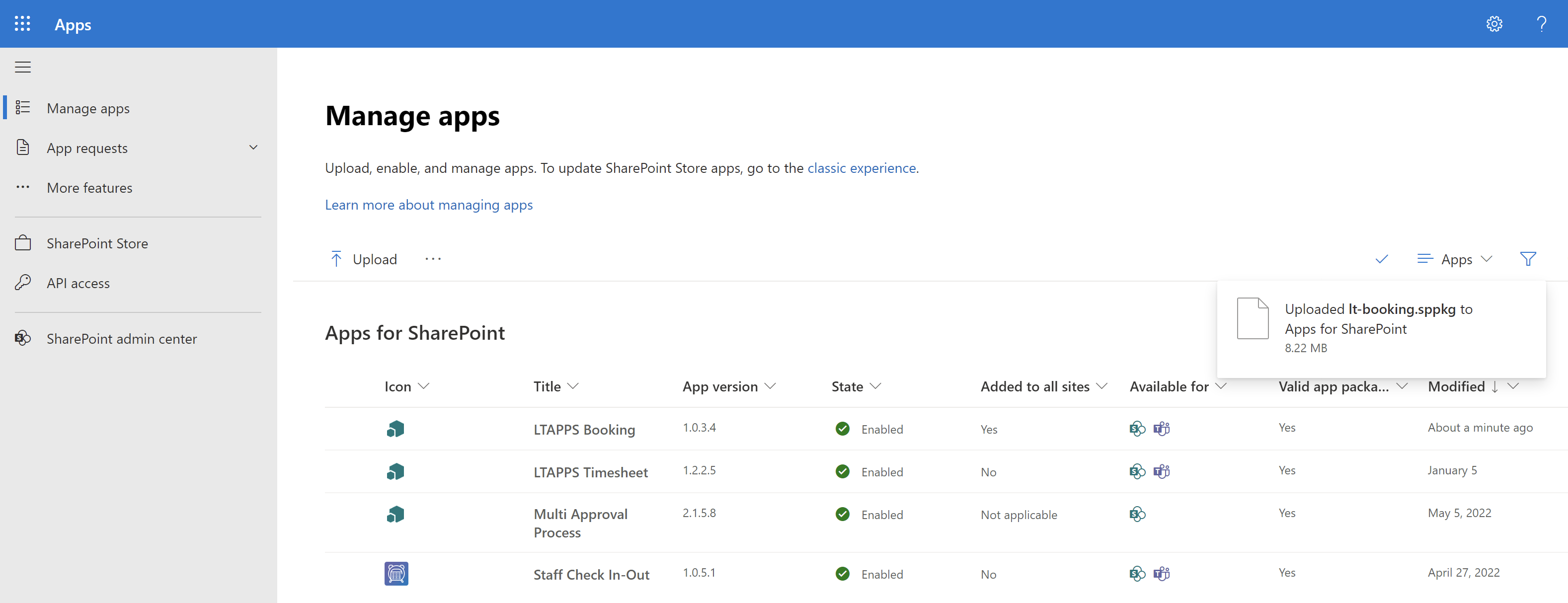 On the More Feature page in the SharePoint Admin page, click on the Open button under the Apps section