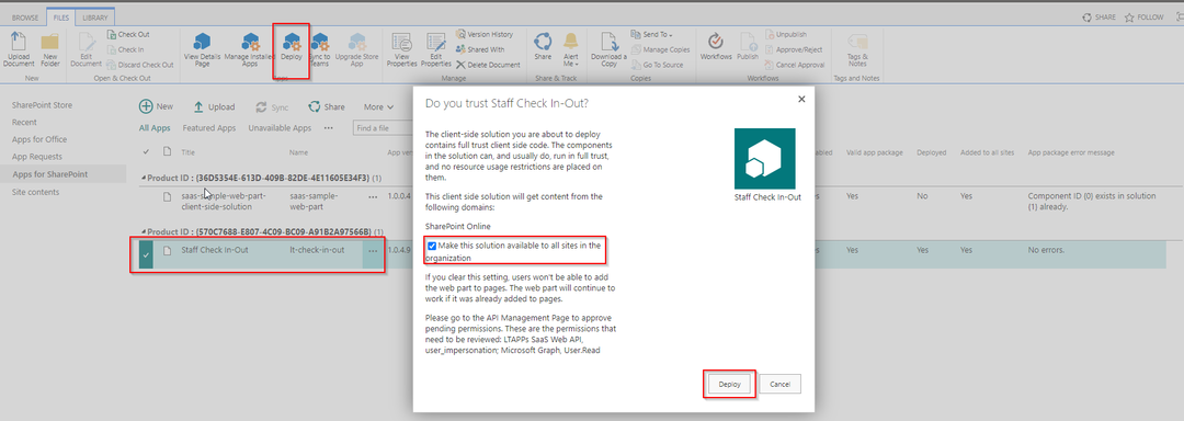 check the “Make this solution available to all sites in the organization” checkbox & click the deploy