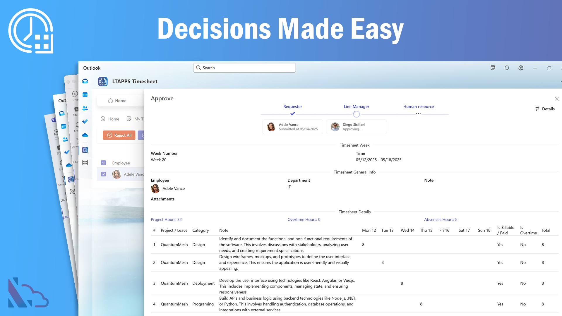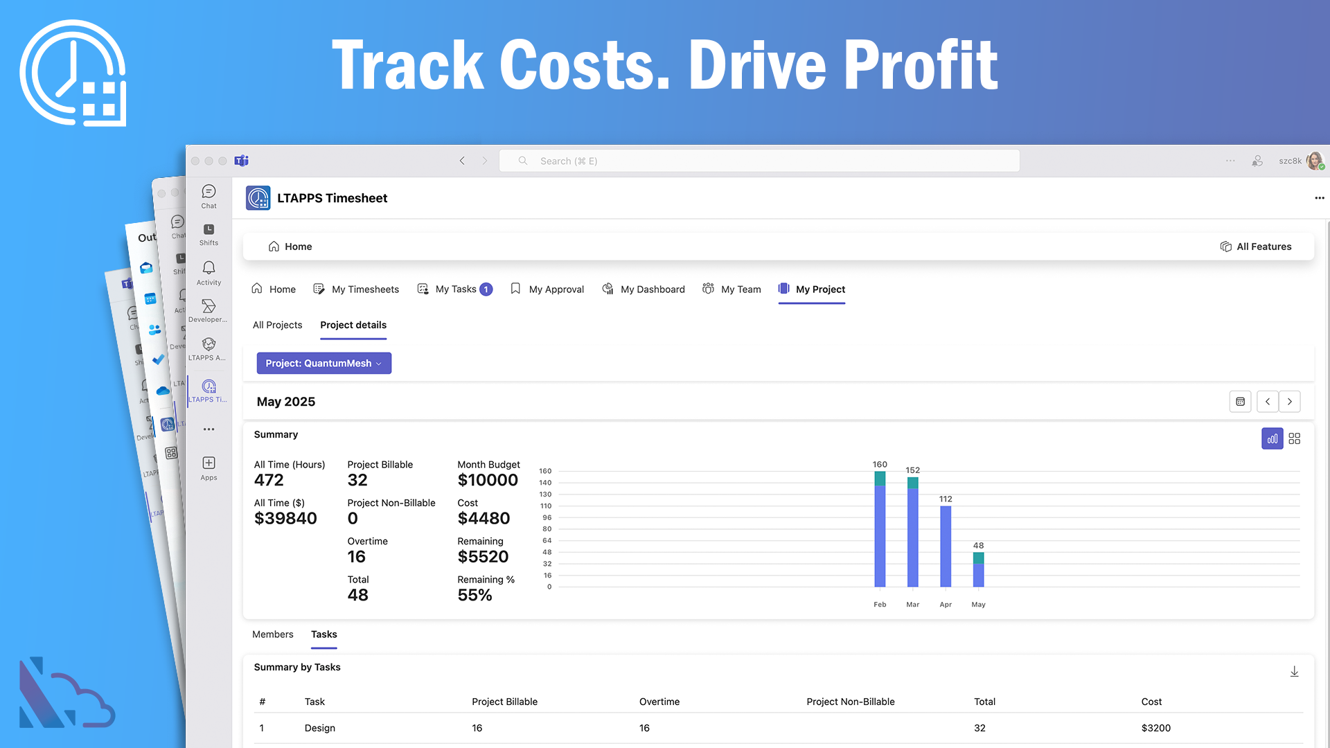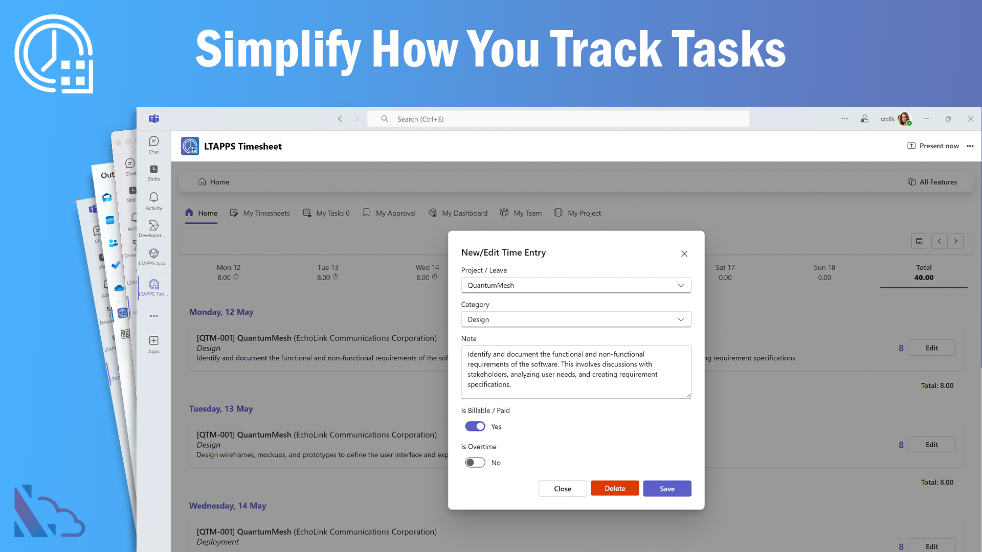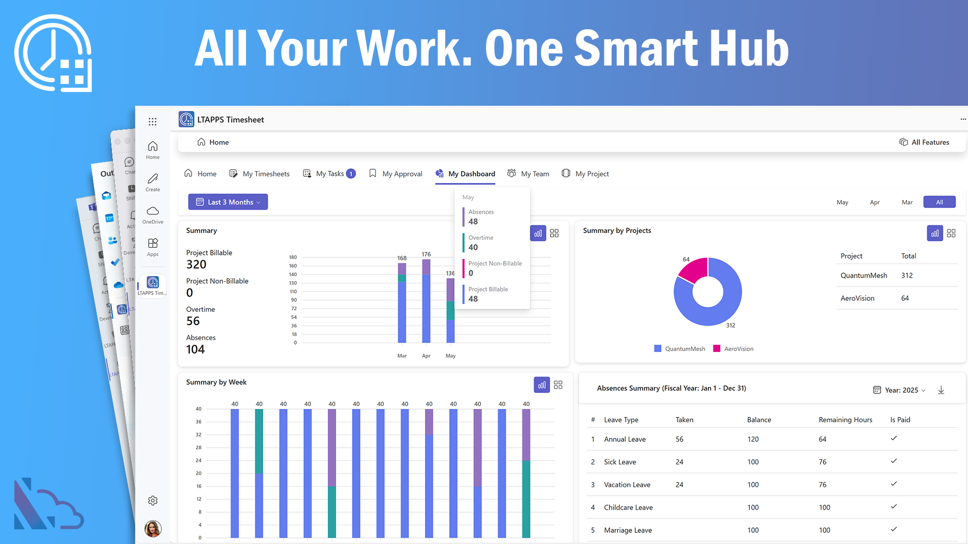 LTAPPS Timesheet TM is a powerful time-tracking app designed for seamless integration with, Microsoft Teams (including mobile), Outlook, Microsoft 365, and SharePoint. It provides an efficient solution for tracking and managing work hours, ensuring accurate time management across projects and tasks. Employees and managers can easily monitor regular work hours, overtime, and absences. It simplifies time tracking, enhances project management, and optimizes workforce productivity.